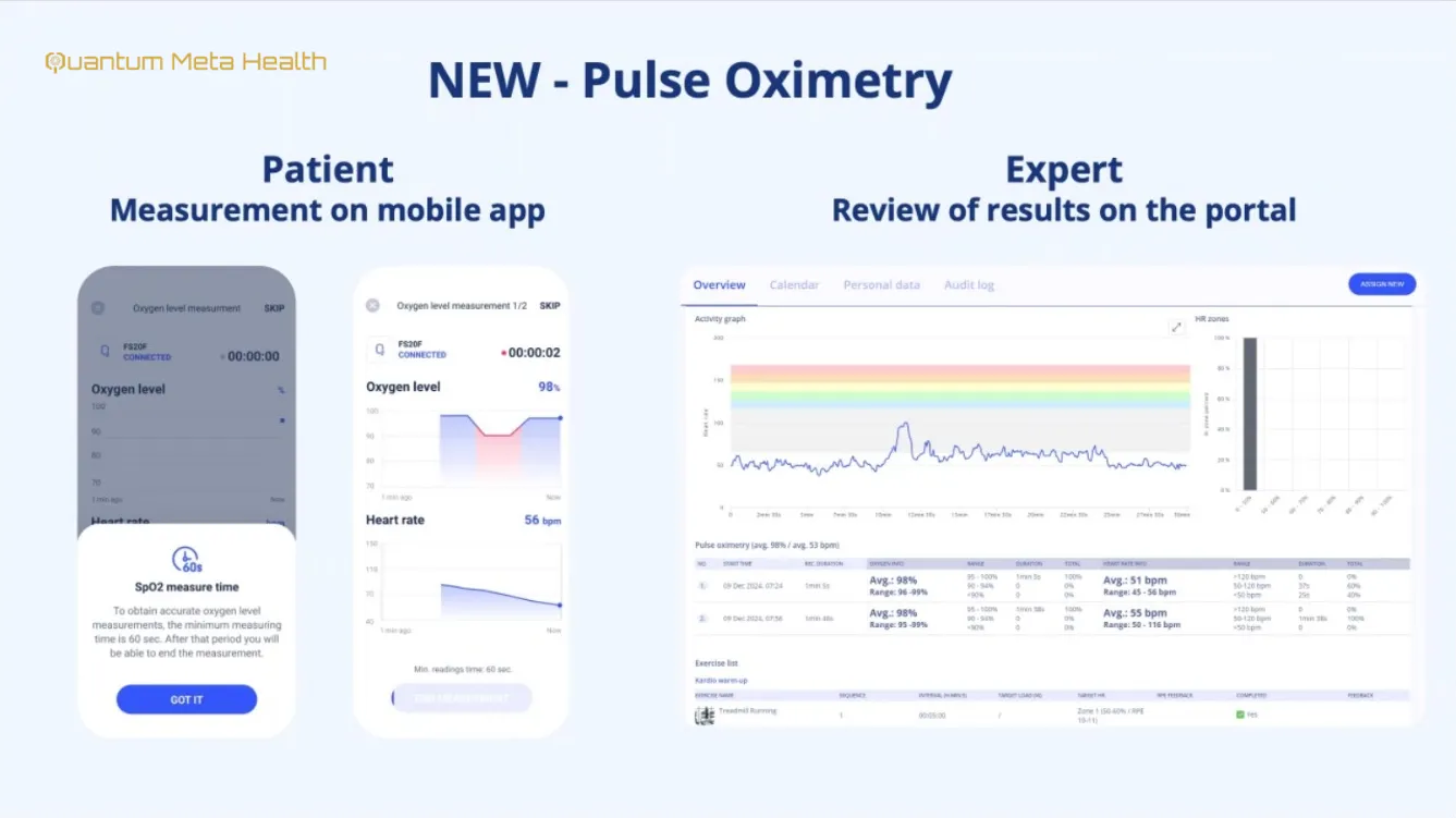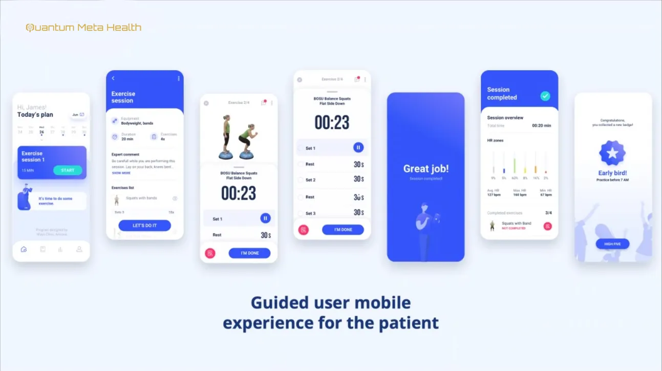 Beyond diagnostics and treatment sessions, the wider QMH concept can extend into long term patient or client engagement through connected mobile care, protocol management, progress monitoring, white label platform integration, and broader device connectivity. The referenced visuals show exercise and protocol libraries, patient progress dashboards, biometric follow up, portal review, and health platform integration pathways.